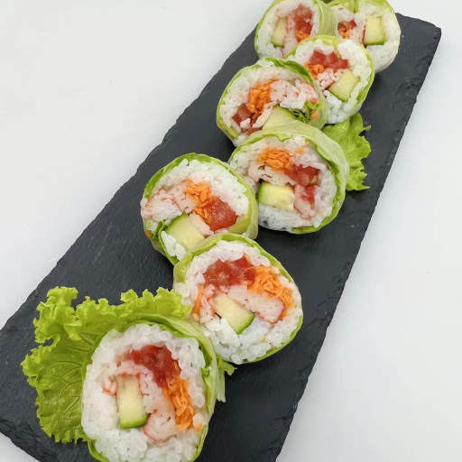 Comme un rouleau de printemps, ce Cristal est un enroulé de surimi dans une feuille de riz puis de salade, avec du riz vinaigré, de la tomate, de la carotte, du concombre et de la menthe.