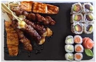 18 pièces variées de makis x6, californias x6 (Composé de saumon, thon, crevette, avocat, concombre, fromage, susceptible à modifications en fonction des jours) et brochettes x6 (yakitori poulet, boulettes poulet-soja, boeuf/fromage, saumon et/ou thon, susceptible à modifications selon disponibilités)